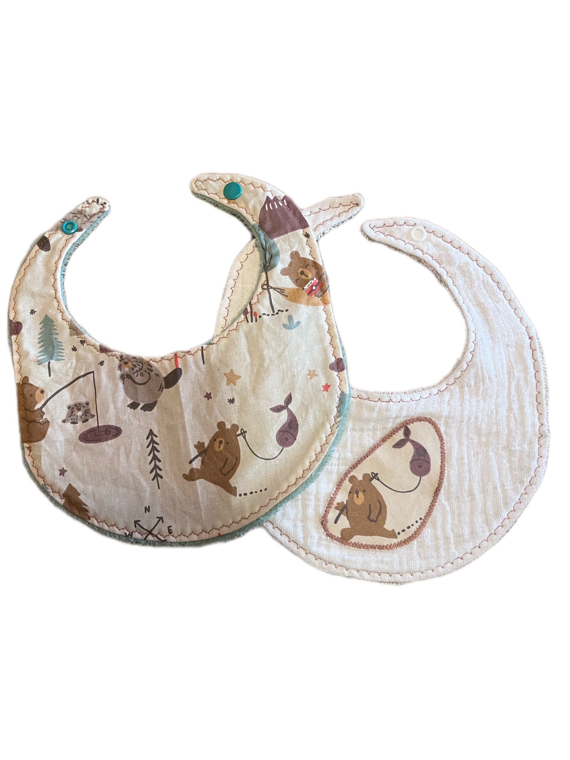 bavoir 1 : coton et éponge de coton, empiècement brodé ourson à la pêche.